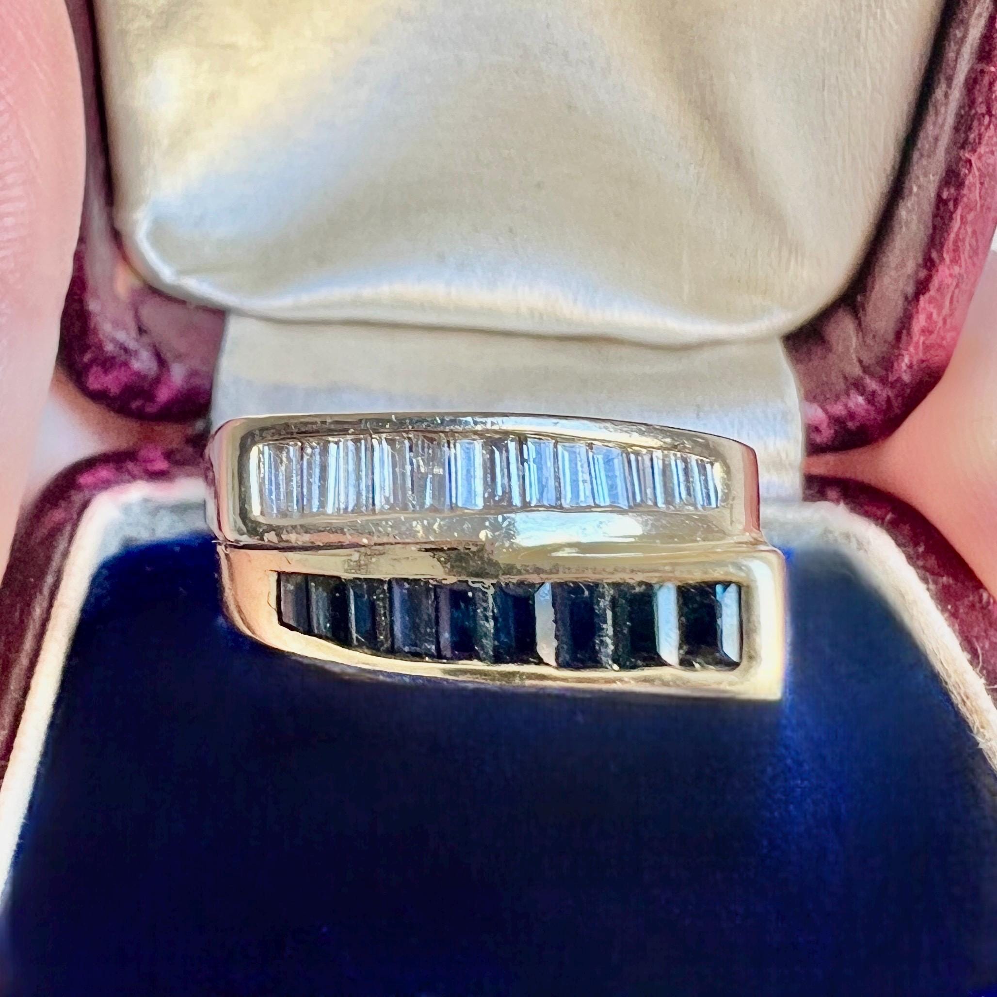 Vintage You and Me two-tone ring in 14-carat yellow and white gold. The yellow gold section is set with 9 natural sapphires, while the white gold section features 14 baguette-cut diamonds.