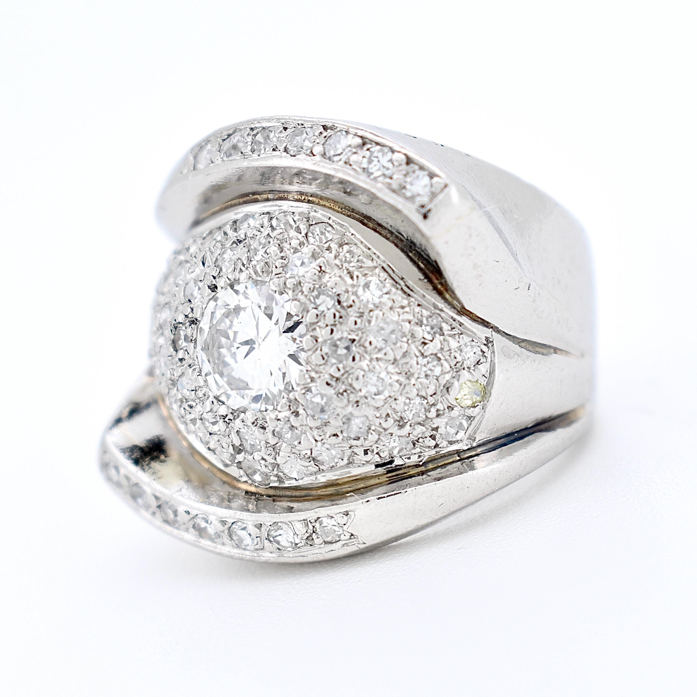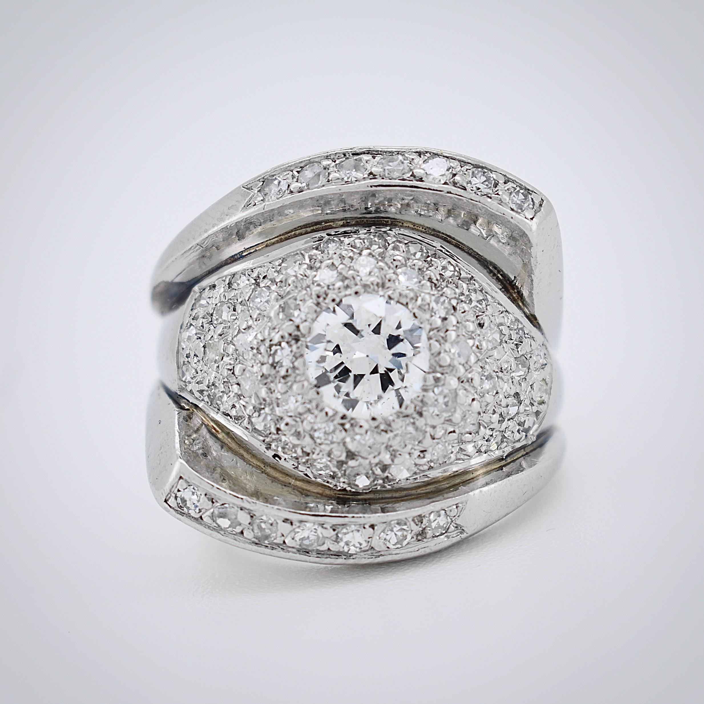 The ring is set with approximately 1.5 carats of diamonds, including a stunning 0.70 ct central diamond. The diamonds are estimated G color and VS1–VS2 clarity, offering excellent brilliance and impressive purity.