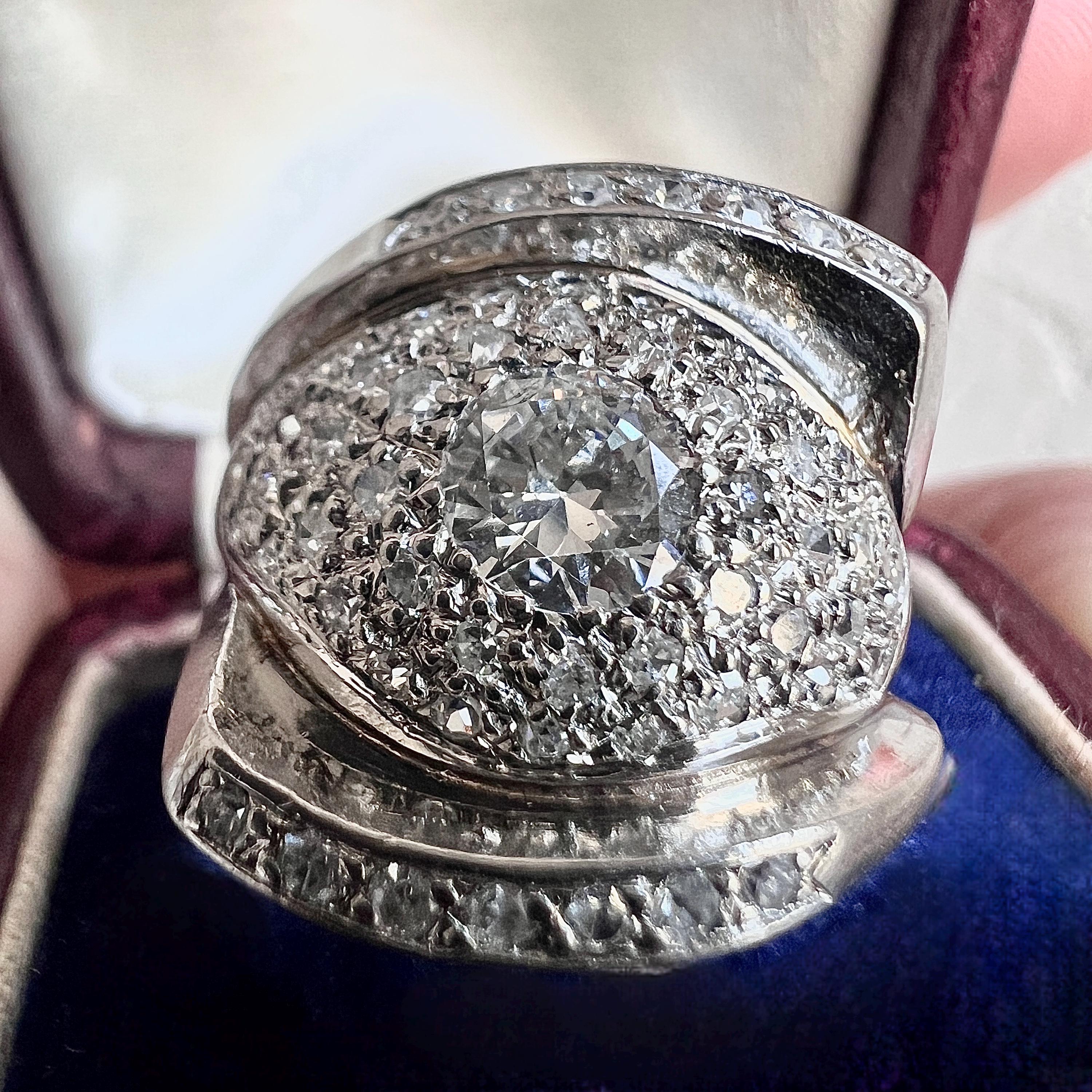 Spectacular Art Deco Tank ring crafted in solid platinum, dating from around 1930. This exceptional ring features the bold architectural lines and geometric harmony that define the finest Art Deco jewelry. Likely made by an important jeweler of the era (though unsigned), it showcases remarkable craftsmanship and a powerful sculptural presence.
