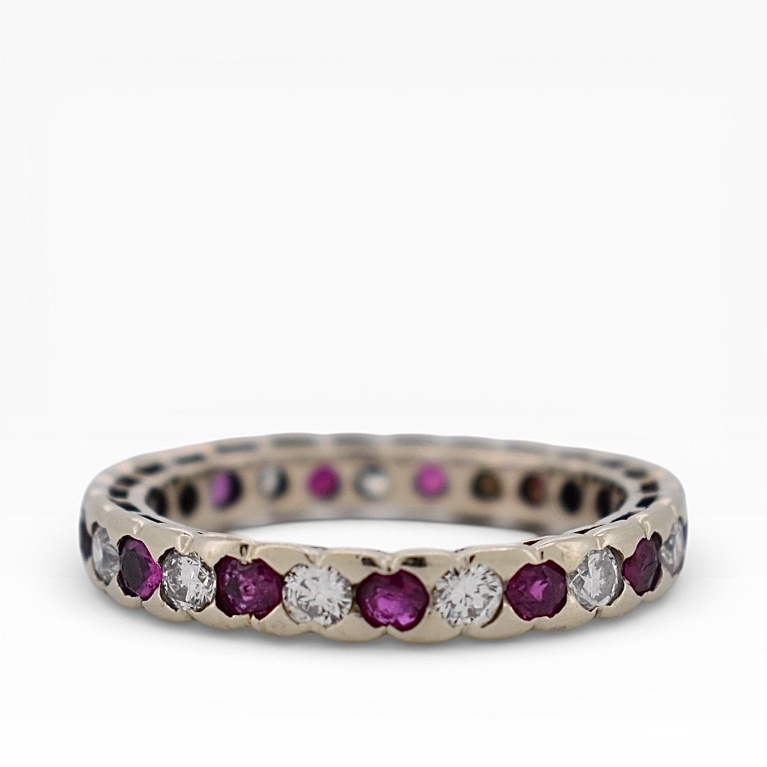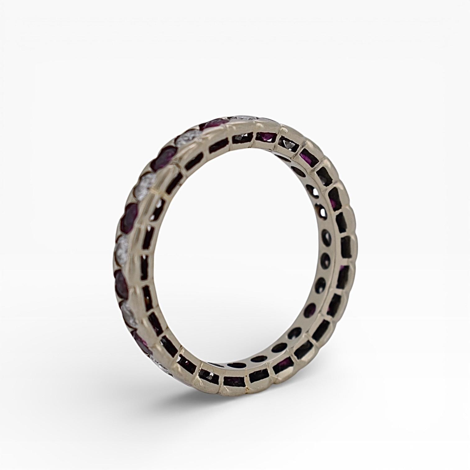 With approximately 1 carat of rubies and 1 carat of diamonds, this full-eternity ring delivers brilliant sparkle from every angle. The diamonds are estimated G/H color, VS2 clarity, ensuring high-quality brilliance, while the rubies bring a rich, passionate red for a luxurious look.