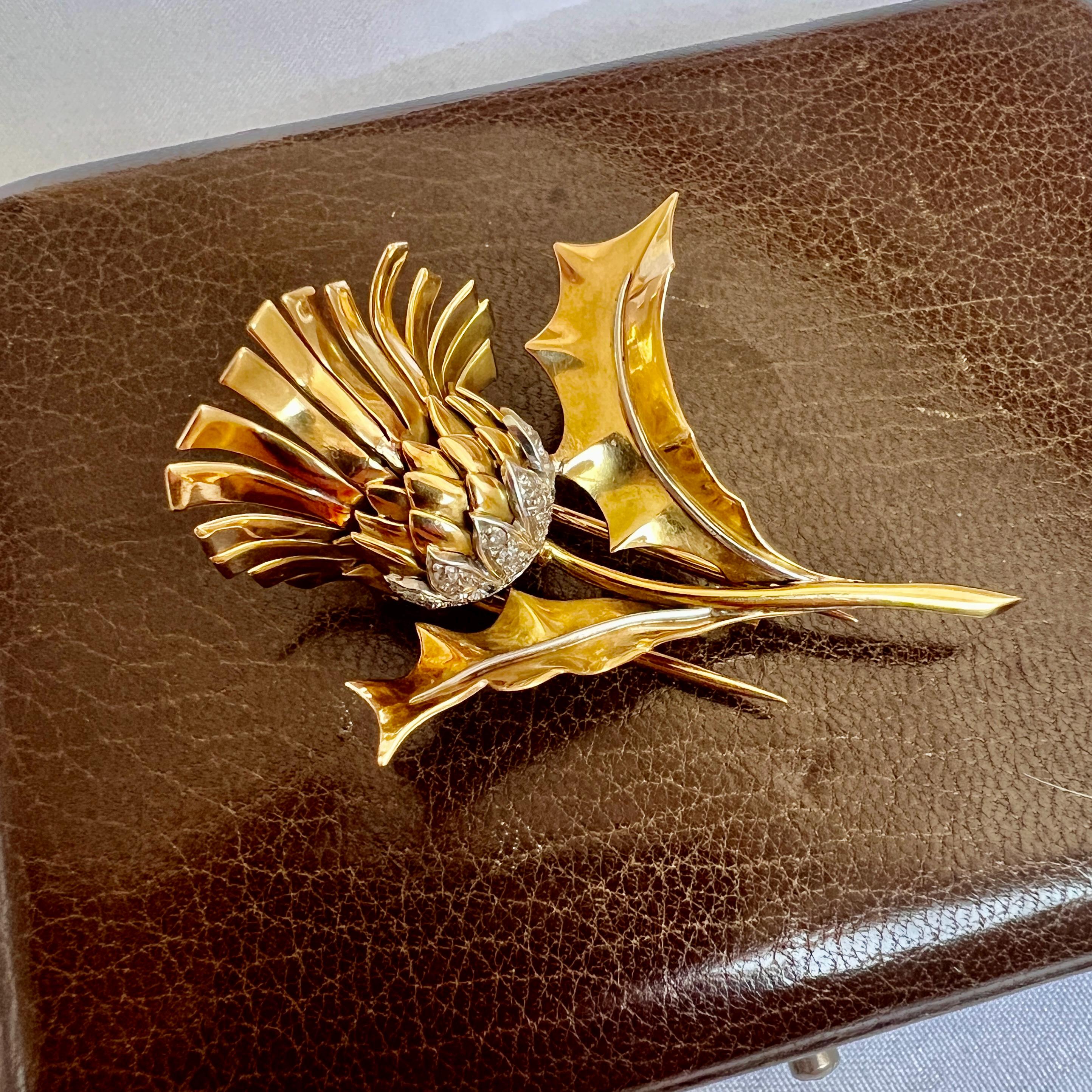 An exceptional signed jewel by Boucheron Paris, this rare vintage brooch-clip from around 1940 is crafted in solid 18K yellow and gray gold. Designed in the elegant shape of a thistle flower, it reflects the refinement and naturalistic inspiration typical of French high jewelry of the period.