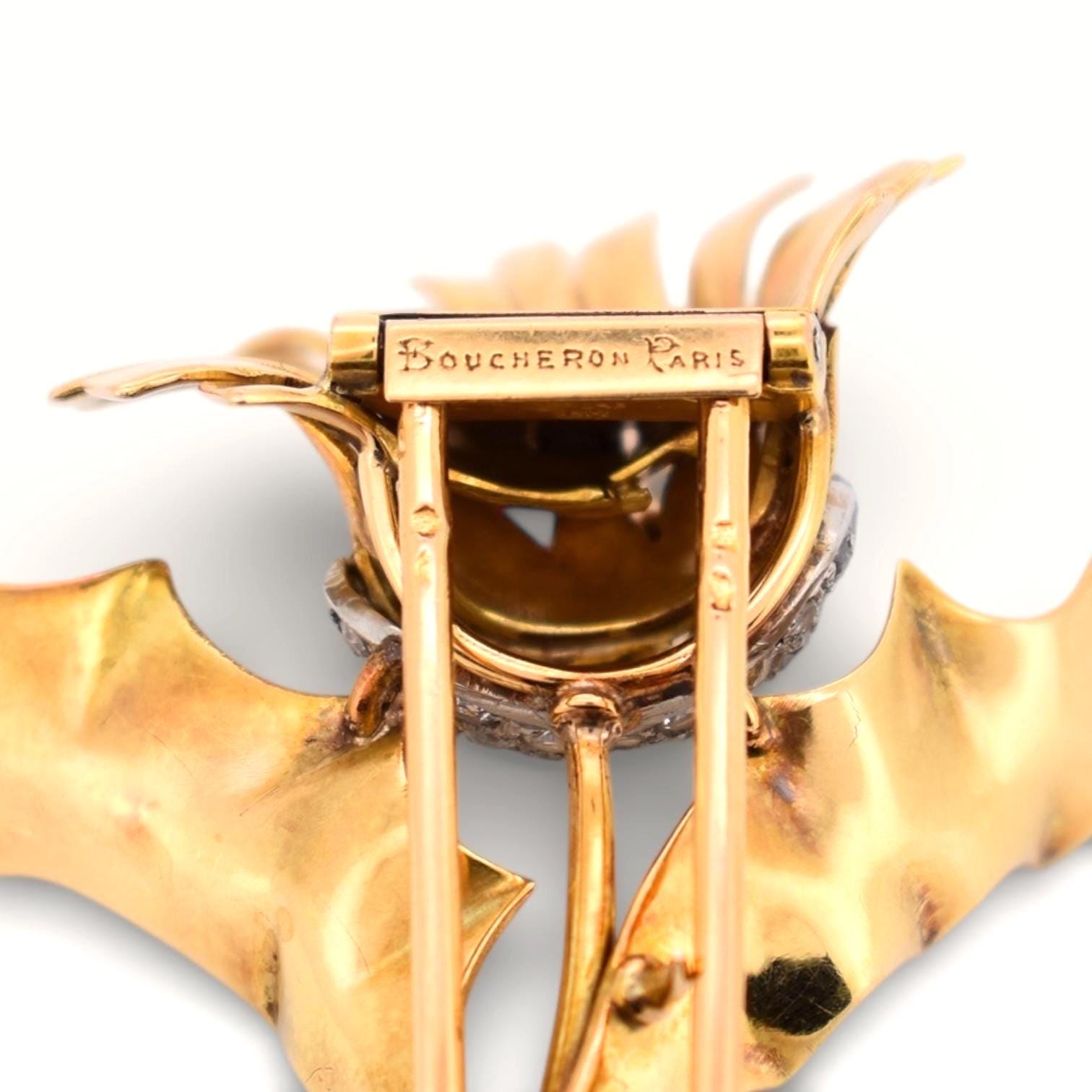 Signed Boucheron Paris, one of the most prestigious French jewelry houses, this brooch is stamped with the eagle head hallmark, certifying 18K gold. A rare collector’s piece, combining artistic design, historic craftsmanship, and luxury heritage.