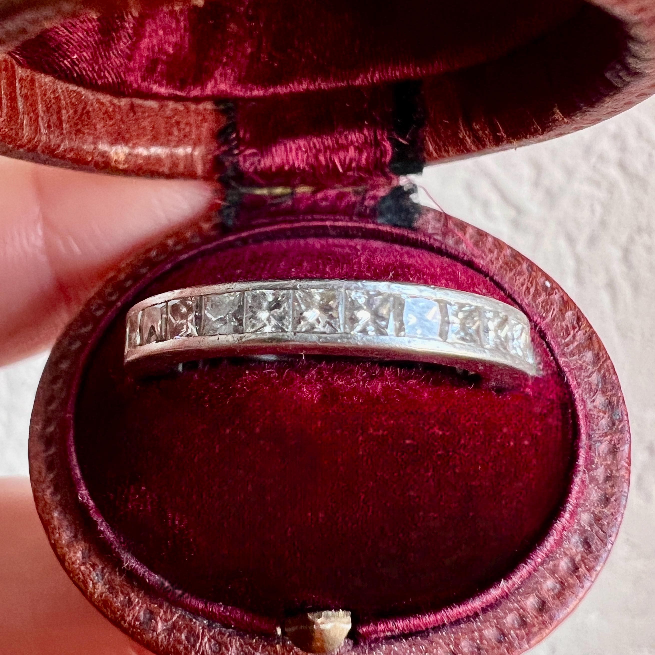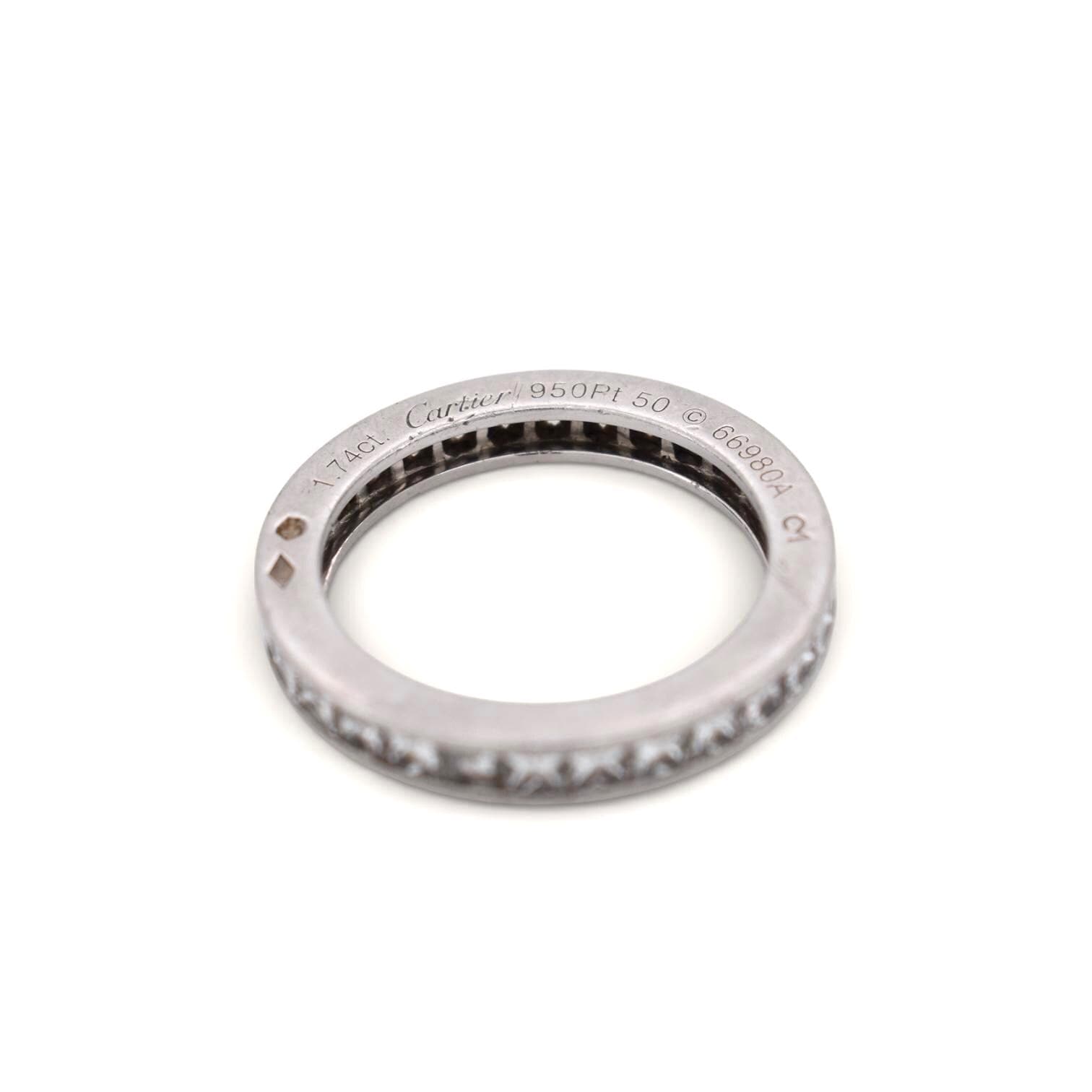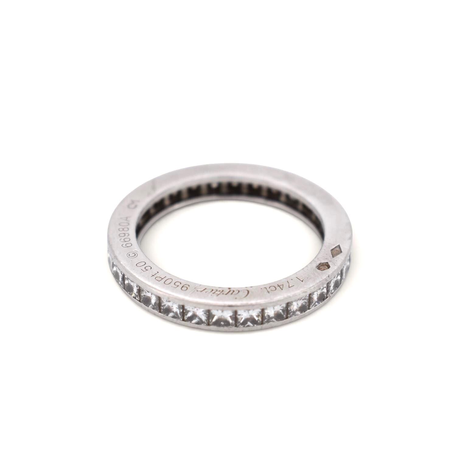 An exceptional signed jewel by Cartier, this rare eternity ring dates from the 1920s Art Deco era. Crafted in solid platinum 950, it features a continuous circle of princess cut diamonds set in an elegant bezel setting.
