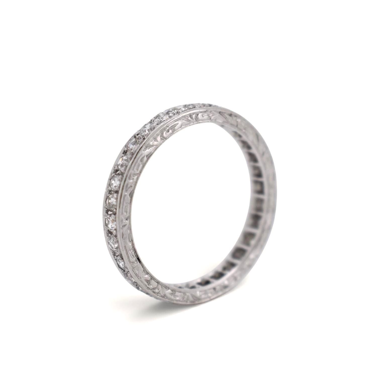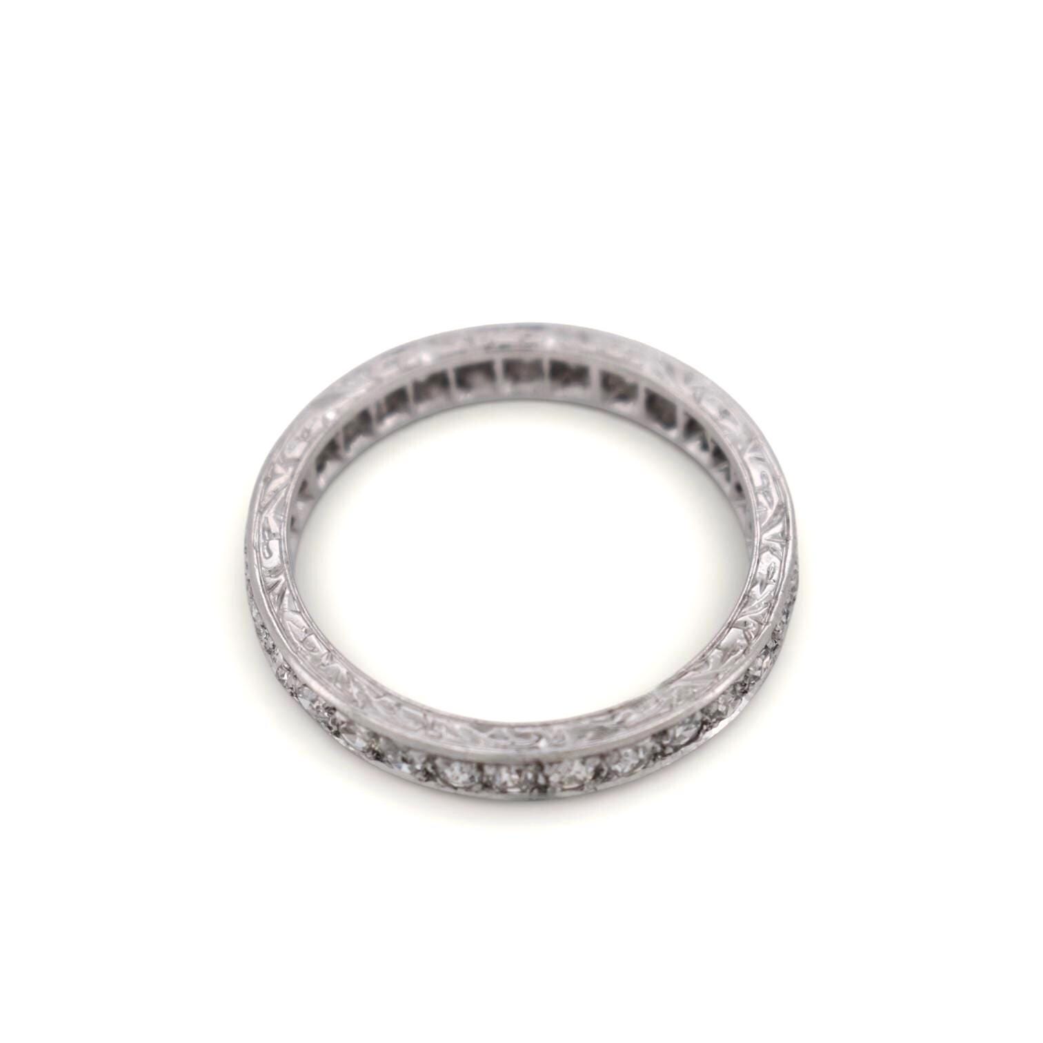 A stunning Art Deco platinum ring from circa 1920, this American-style eternity band features a continuous circle of old-cut diamonds, meticulously set around the entire band. Each diamond is carefully engraved into the platinum, with fully engraved sides, showcasing exceptional craftsmanship from the Art Deco era.