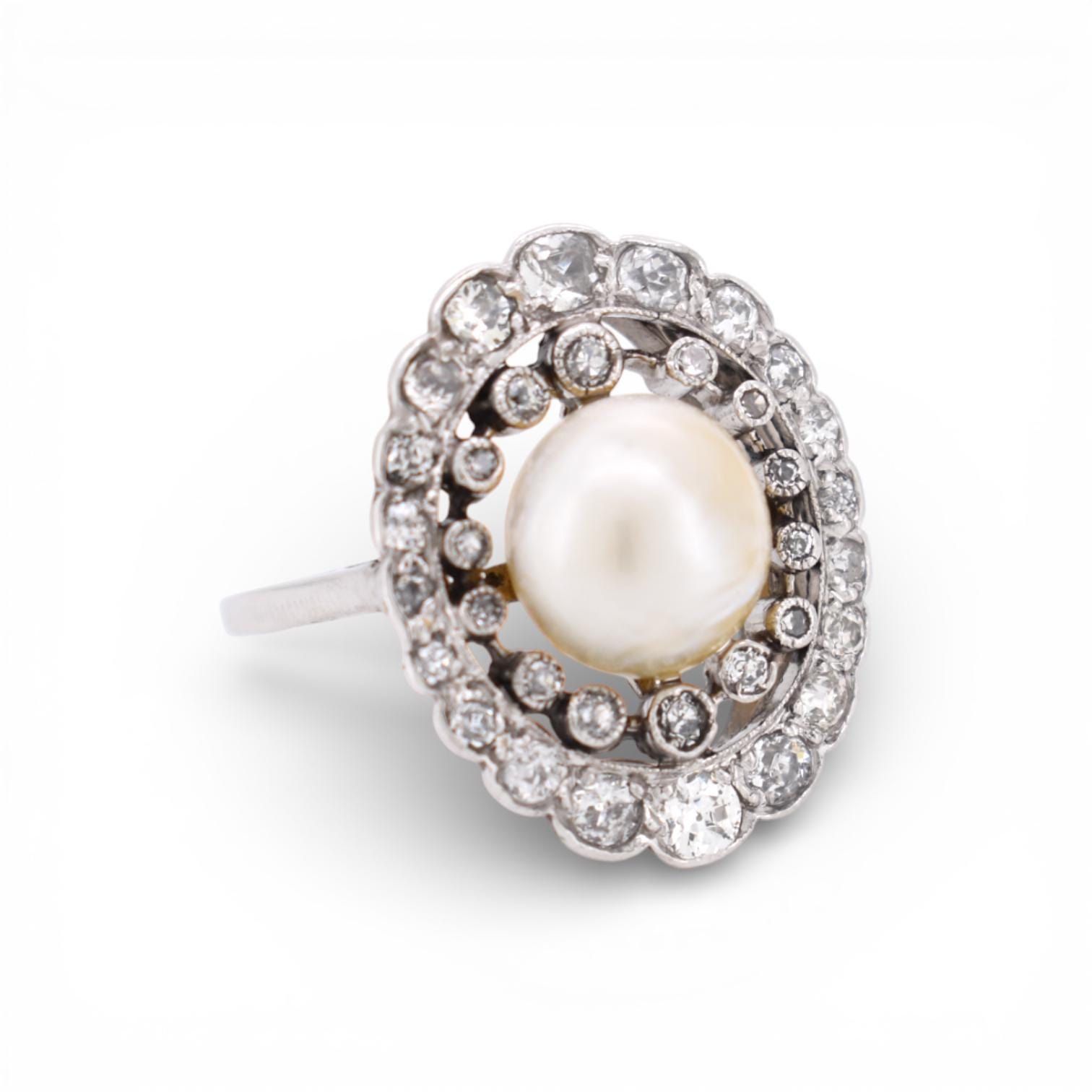 Exceptional Edwardian ring (circa 1910) crafted in platinum. This exquisite ring features a natural round pearl and old-cut diamonds for approx. 2 carats.