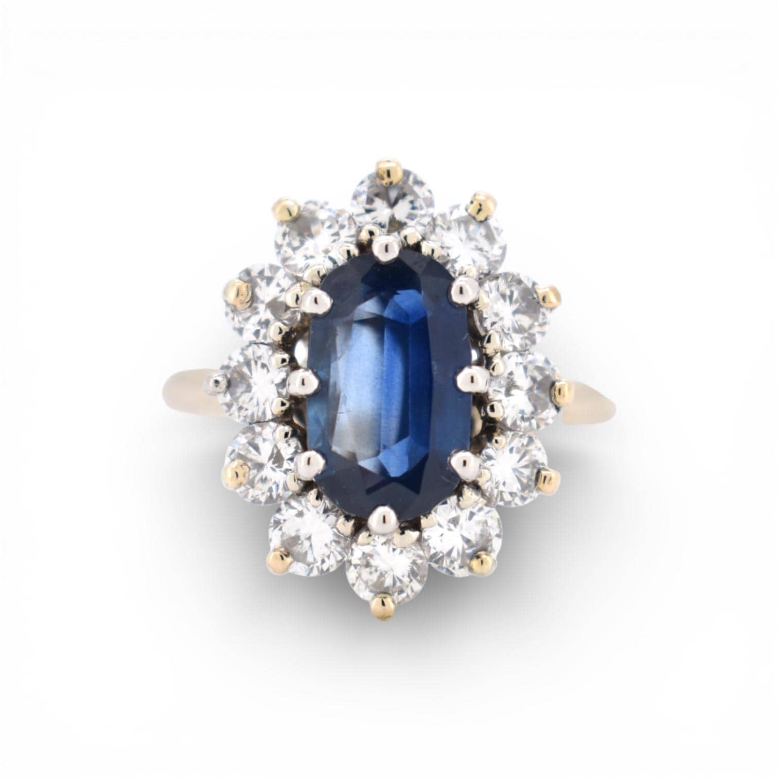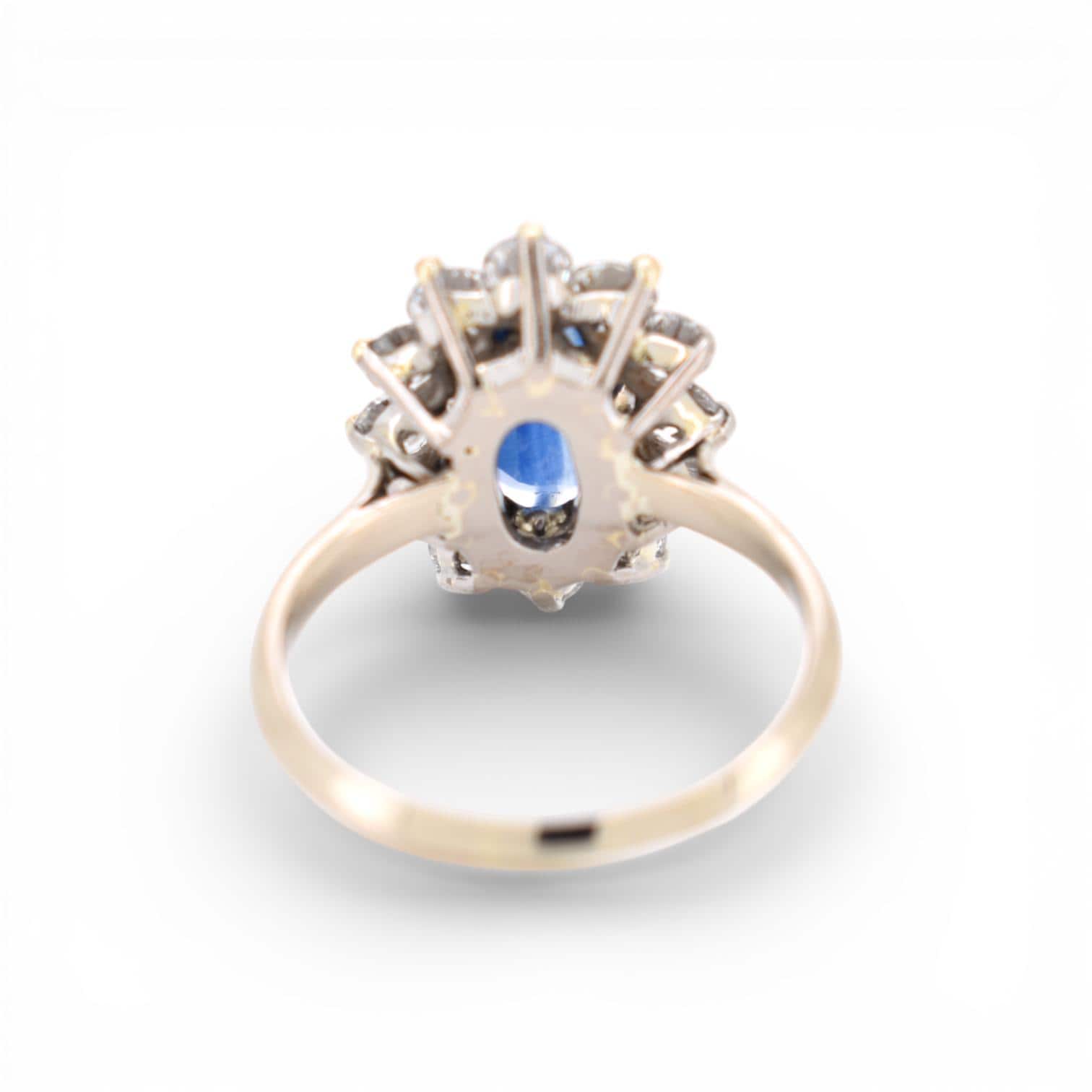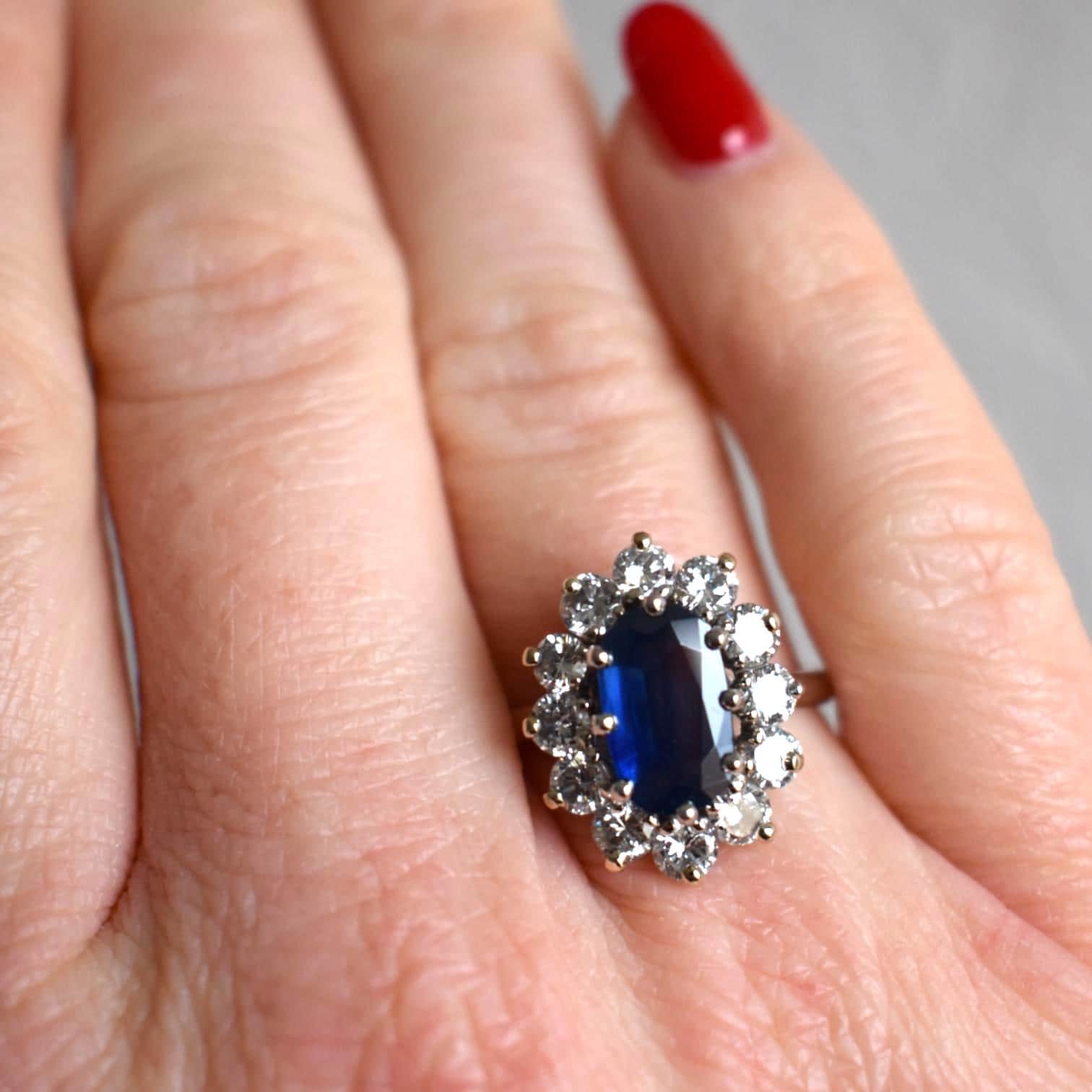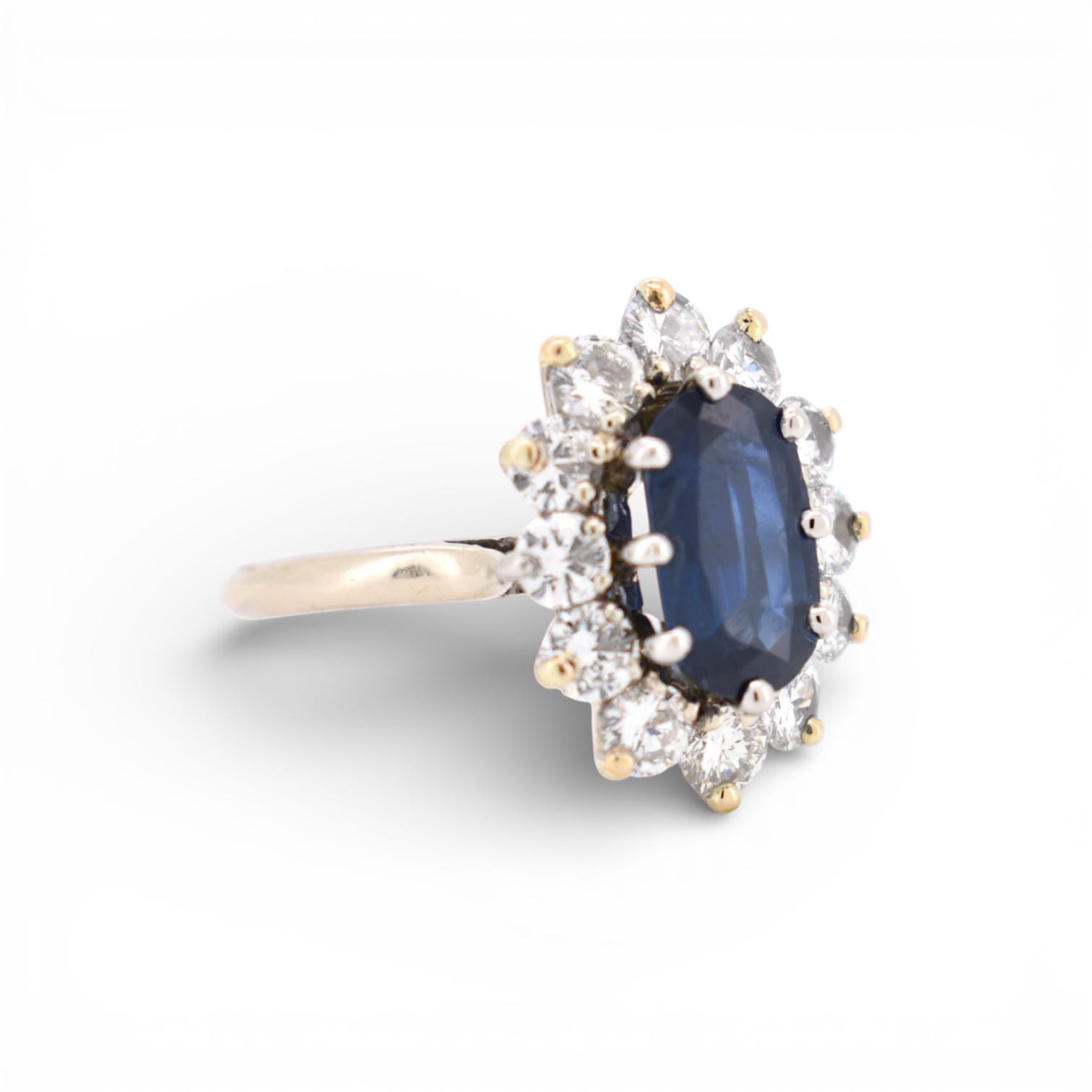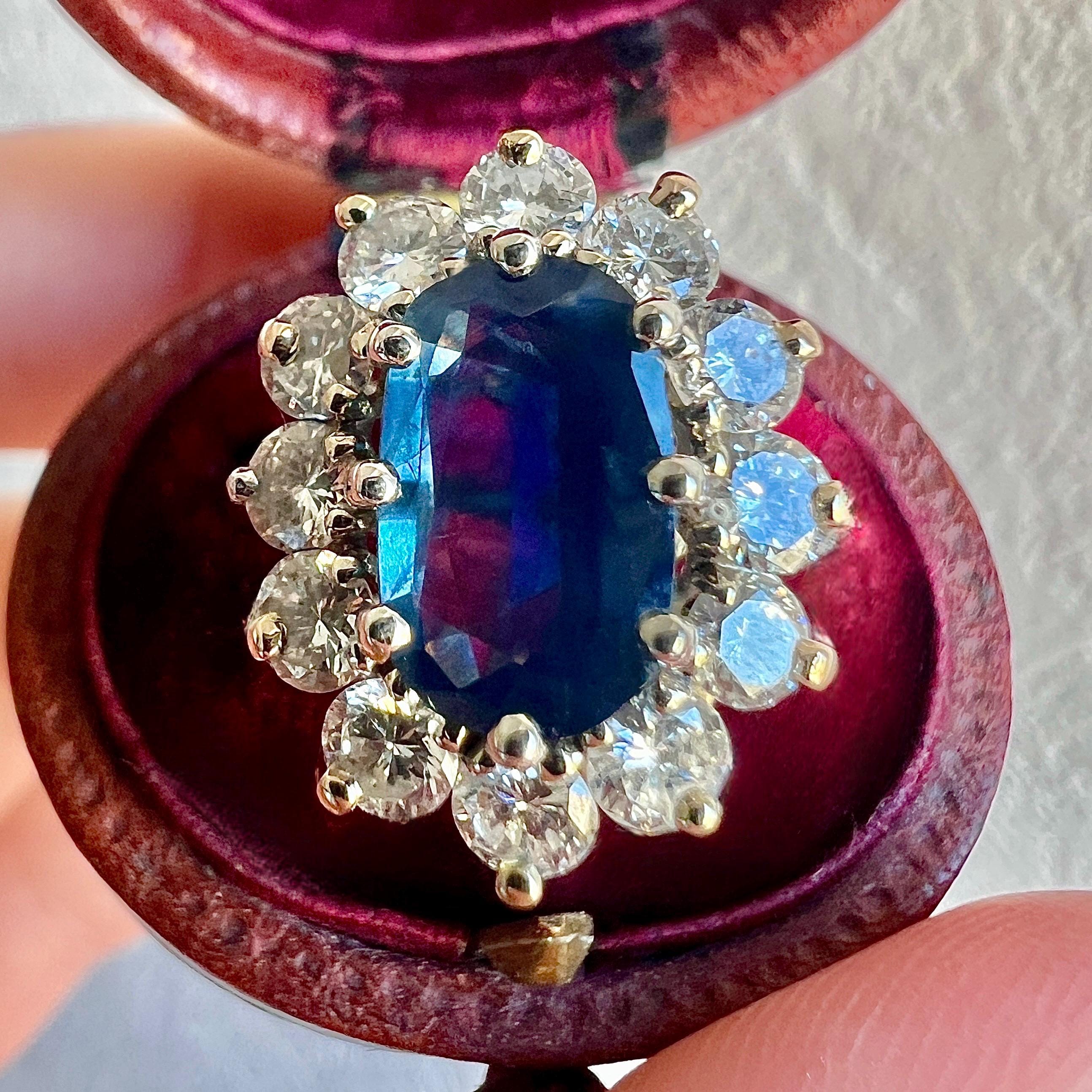Authentic vintage sapphire and brillant diamonds cluster ring crafted in solid 18K gold, a refined statement piece of fine estate jewelry from the 1990s.