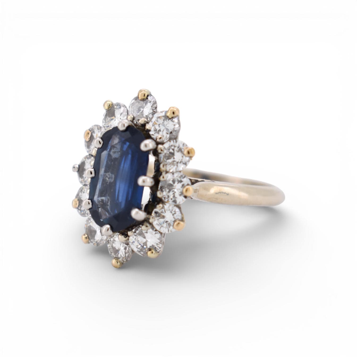 This vintage cluster ring from circa 1990 features a striking combination of deep blue natural sapphires and high-quality diamonds, beautifully set in solid 18K gold.