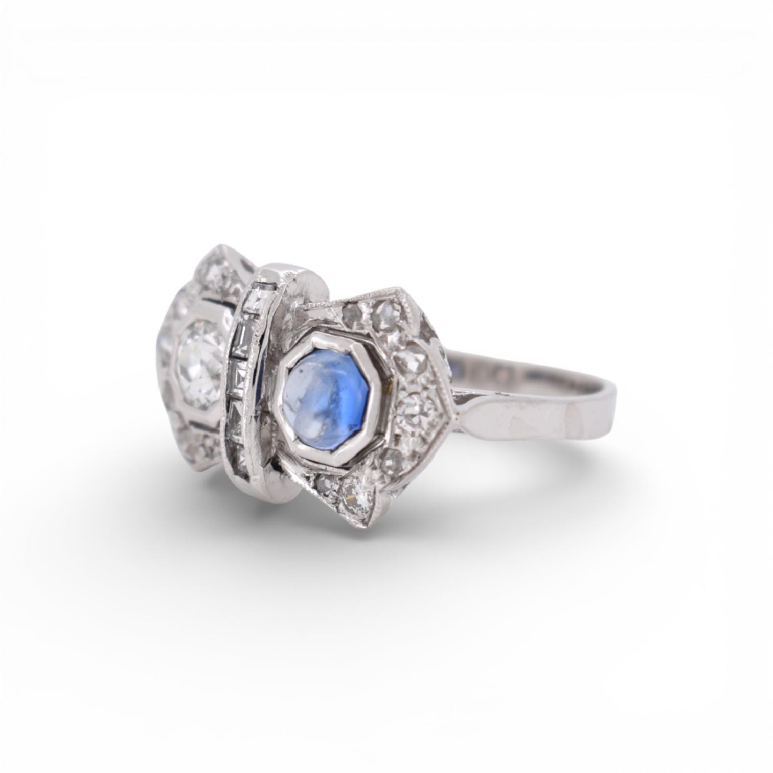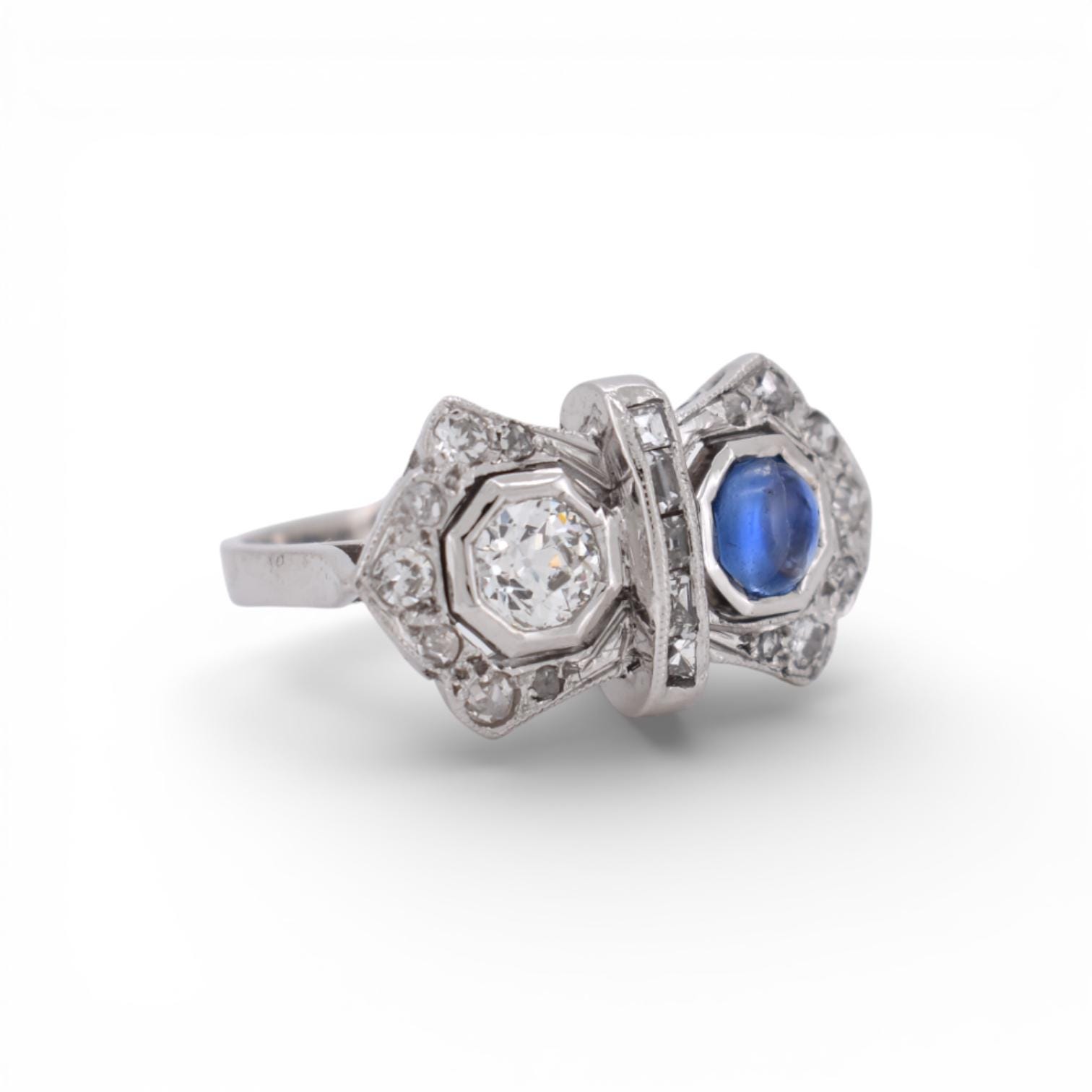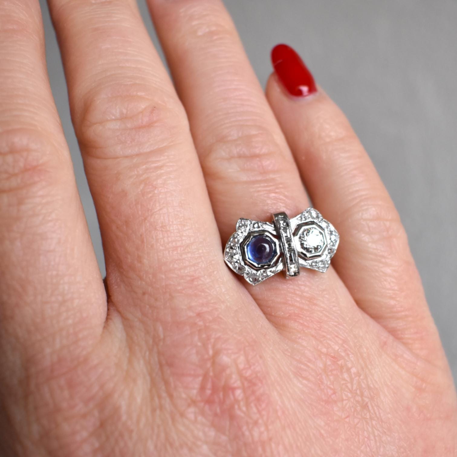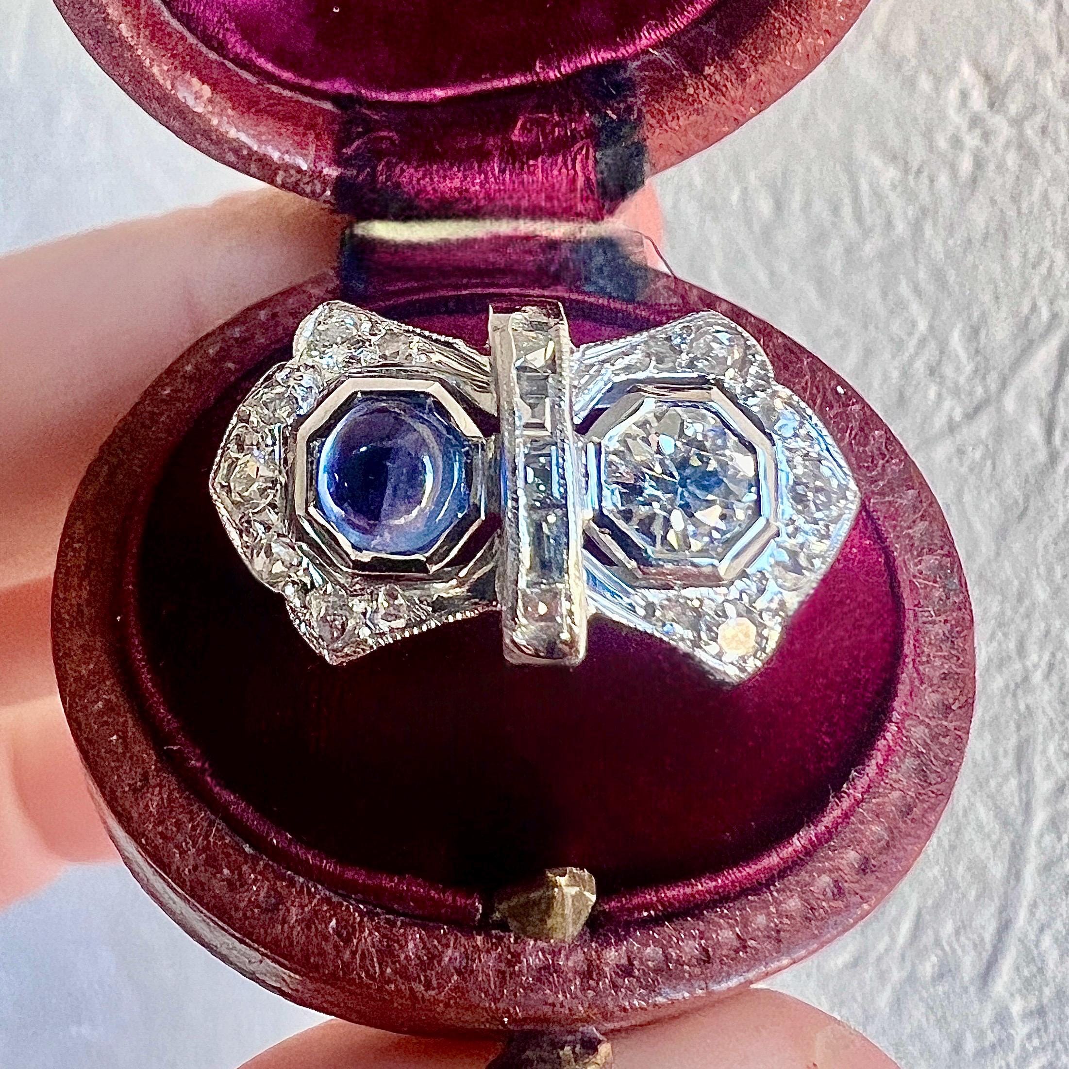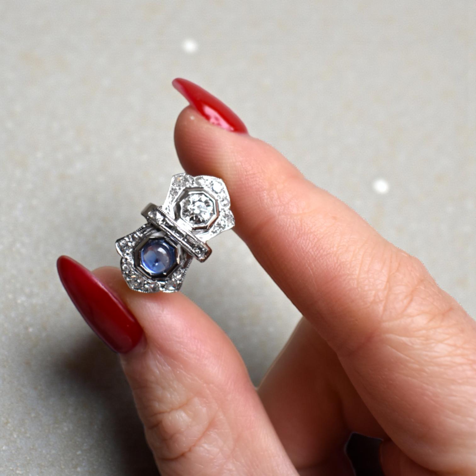 1920 French Art Deco you and Me Ring Crafted in 18-carat white gold. This exquisite ring features a natural sapphire cabochon of approximately 0.3 carat and an old-cut diamond of around 0.3 carats. This two stones are surrounded by roses diamonds for approx. 0,5 carat - Birthday Ring, Engagement Ring, Gift for Her, Two Stones Ring, Art Deco ring