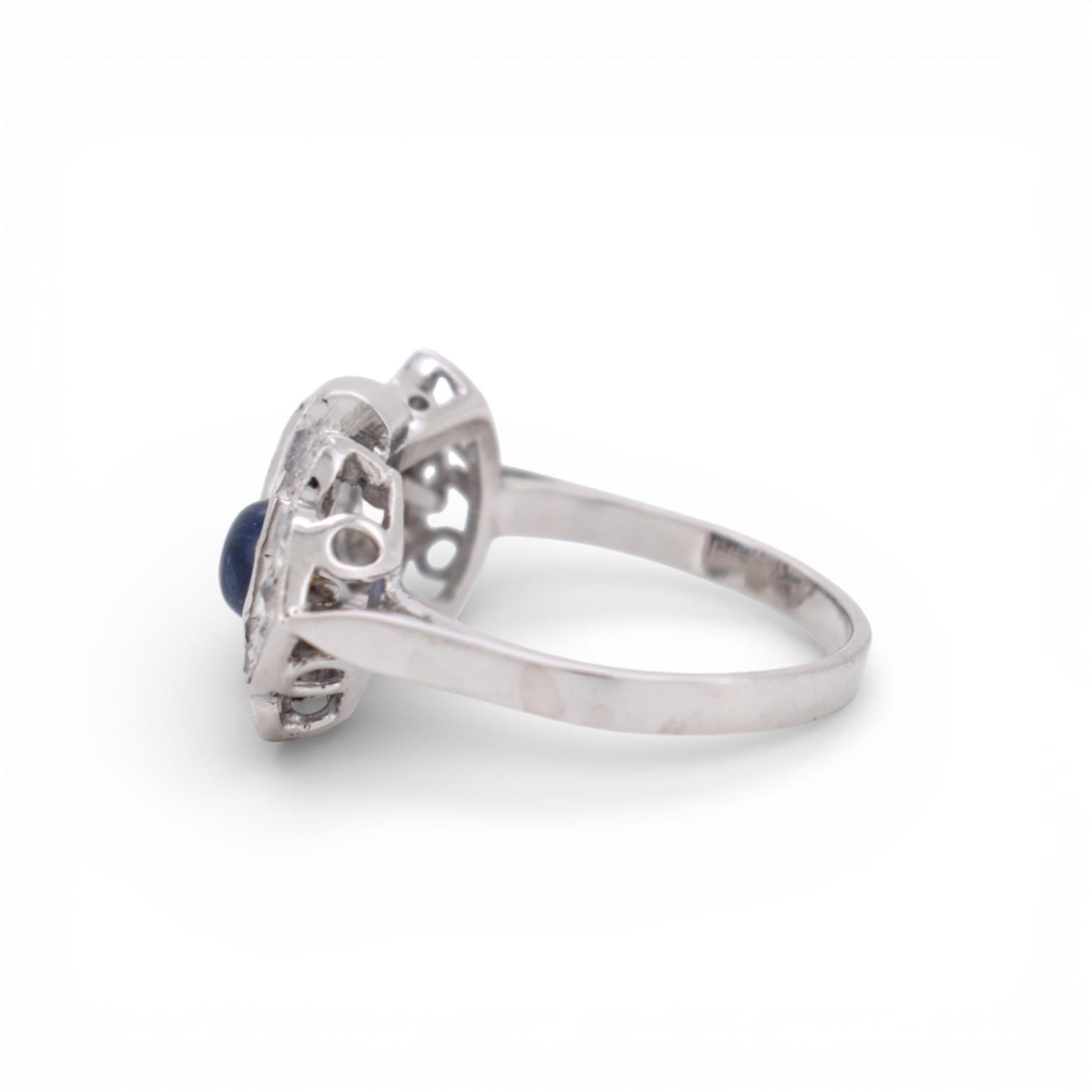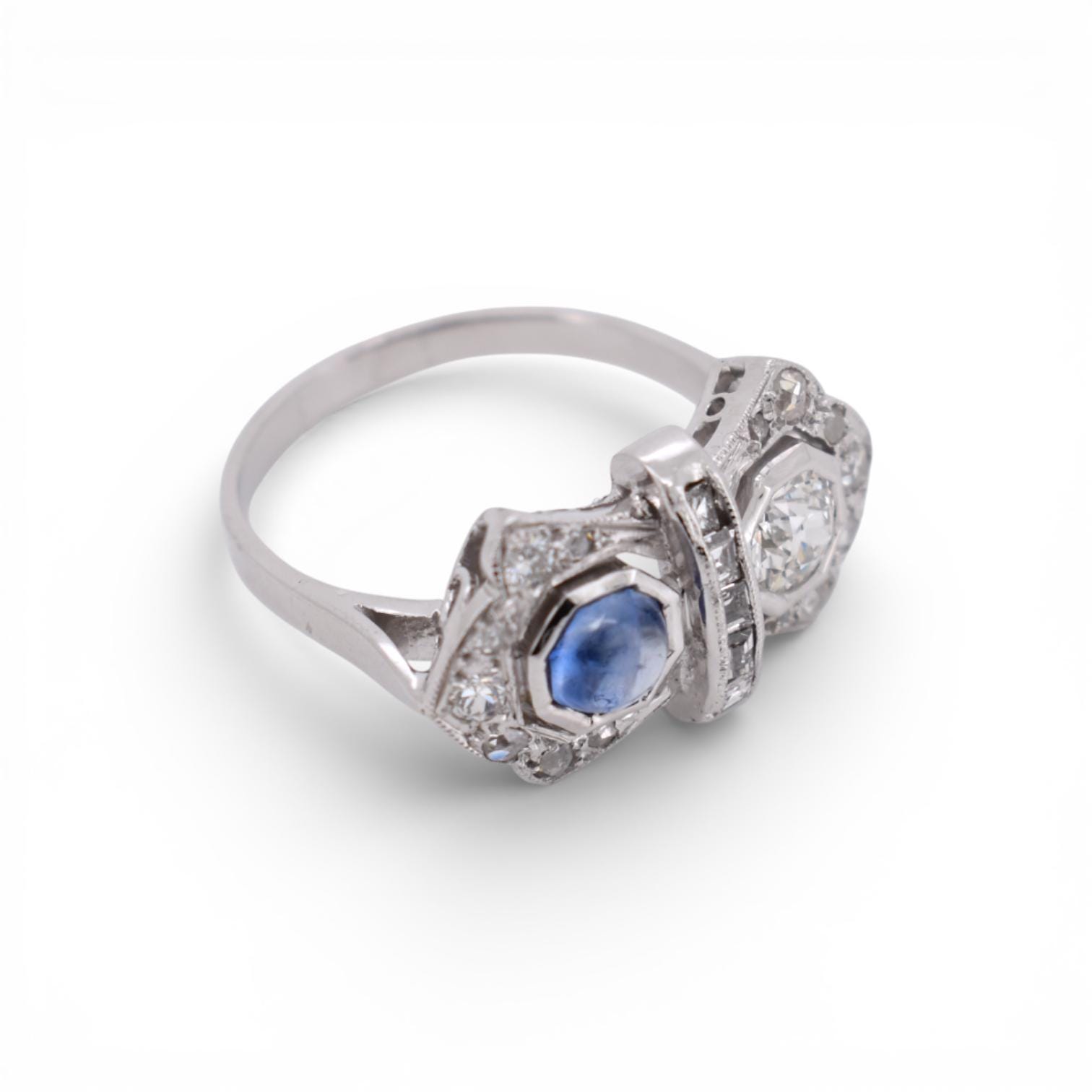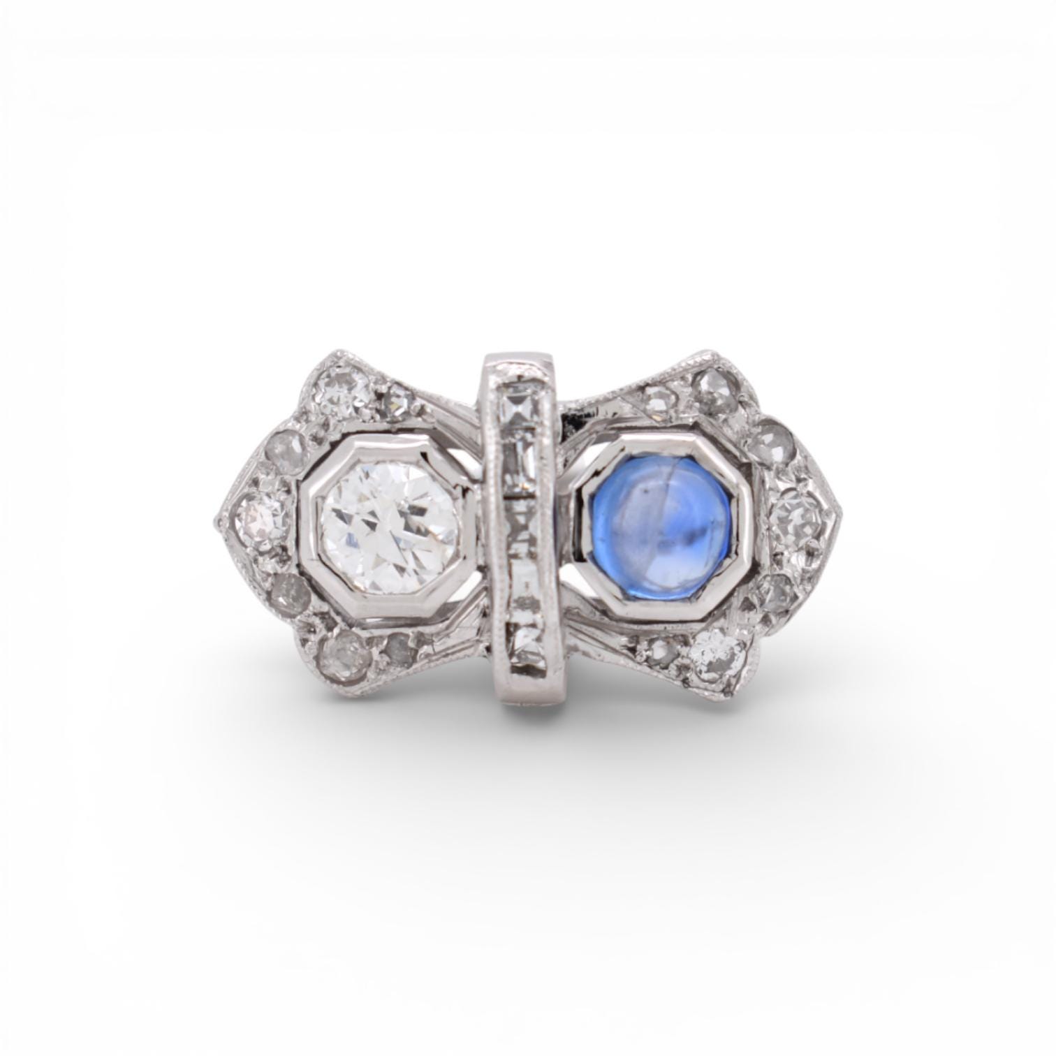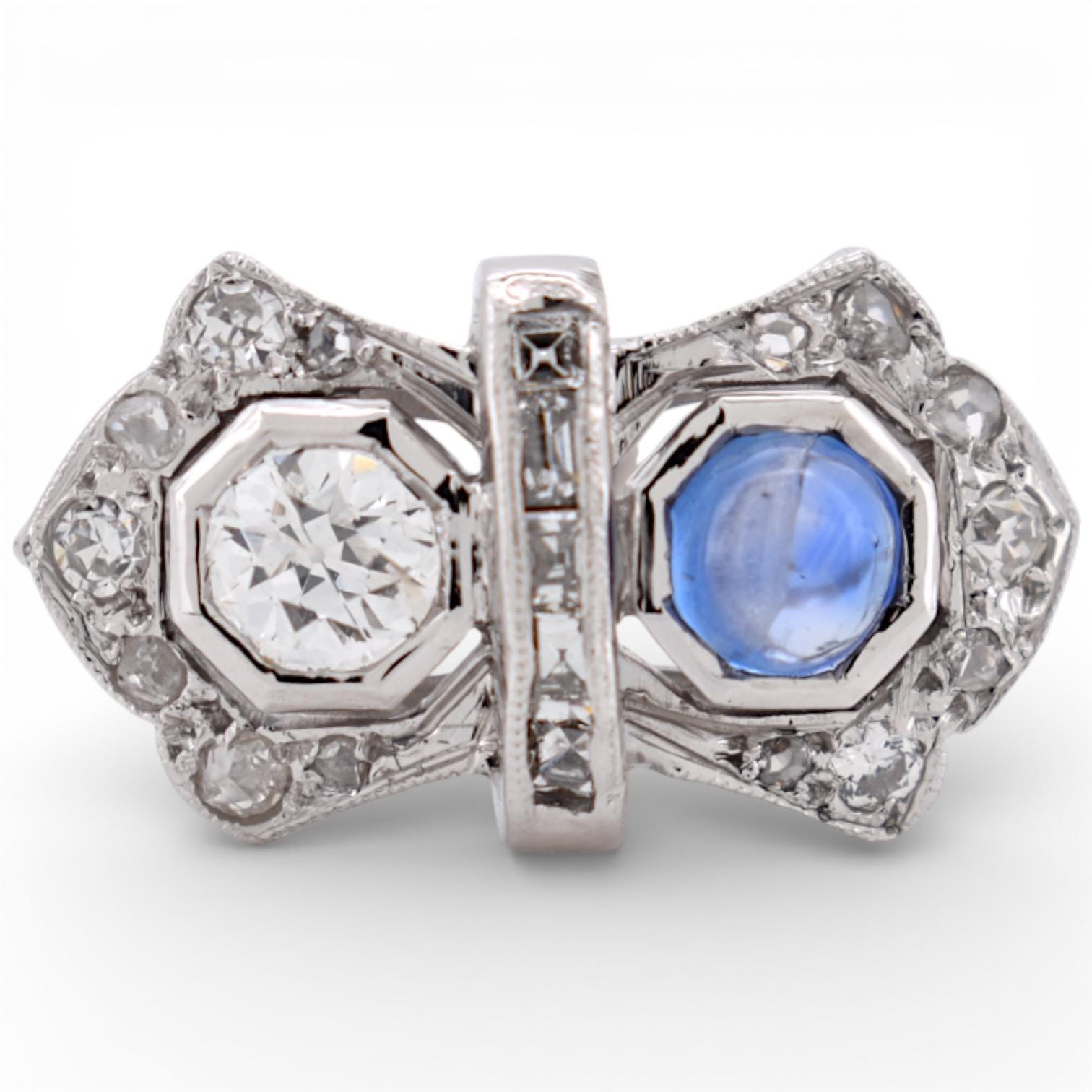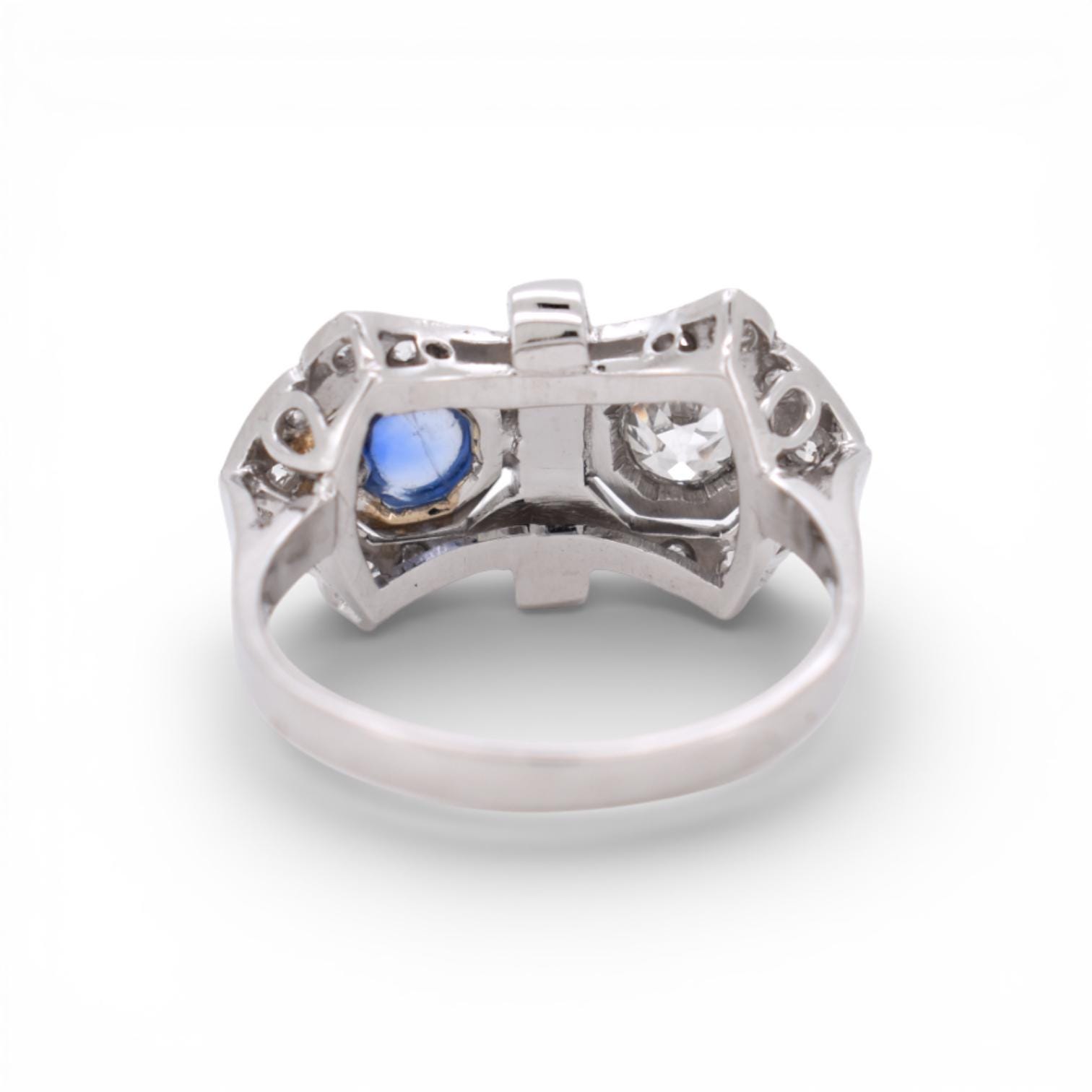 1920 French Art Deco you and Me Ring Crafted in 18-carat white gold. This exquisite ring features a natural sapphire cabochon of approximately 0.3 carat and an old-cut diamond of around 0.3 carats. This two stones are surrounded by roses diamonds for approx. 0,5 carat - Birthday Ring, Engagement Ring, Gift for Her, Two Stones Ring, Art Deco ring